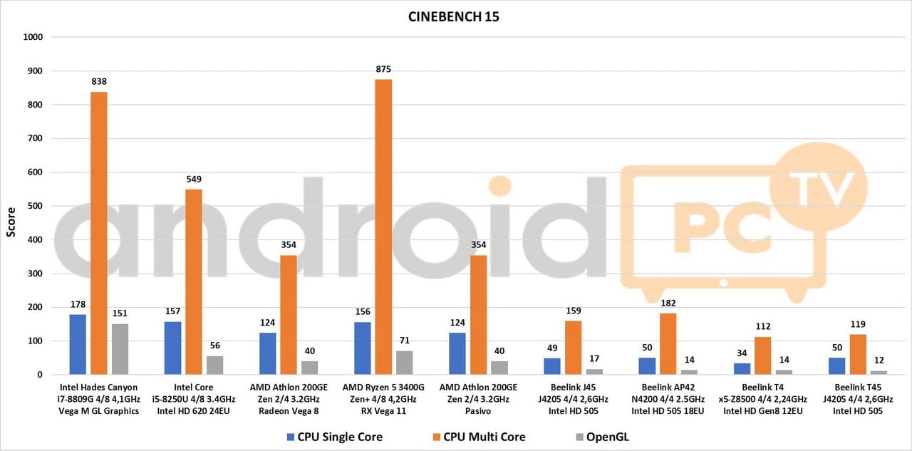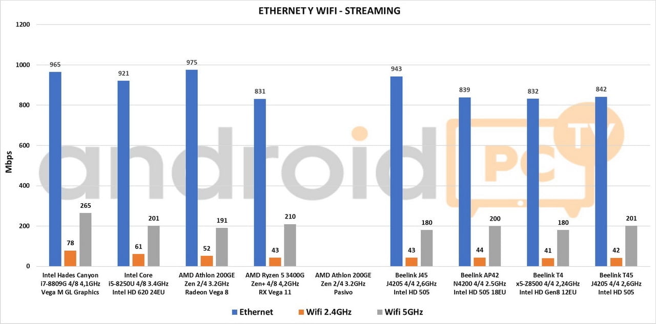 Installed in the Beelink T45 mini PC we find an Intel Pentium J4205 with four cores, four threads running between 1.5 and 2.6 GHz and an Intel HD Graphics GPU 505 up to 800 MHz with 18 EU. A chip manufactured in 14nm has a maximum consumption of 10 W TDP. The results as we see are below several rivals since the speed is limited to 1.5GHz and the turbo never go up to keeps the fanless temperatures low. A mini PC that works correctly for browsing, multimedia playback with KODI and office automation use at the basic user level.